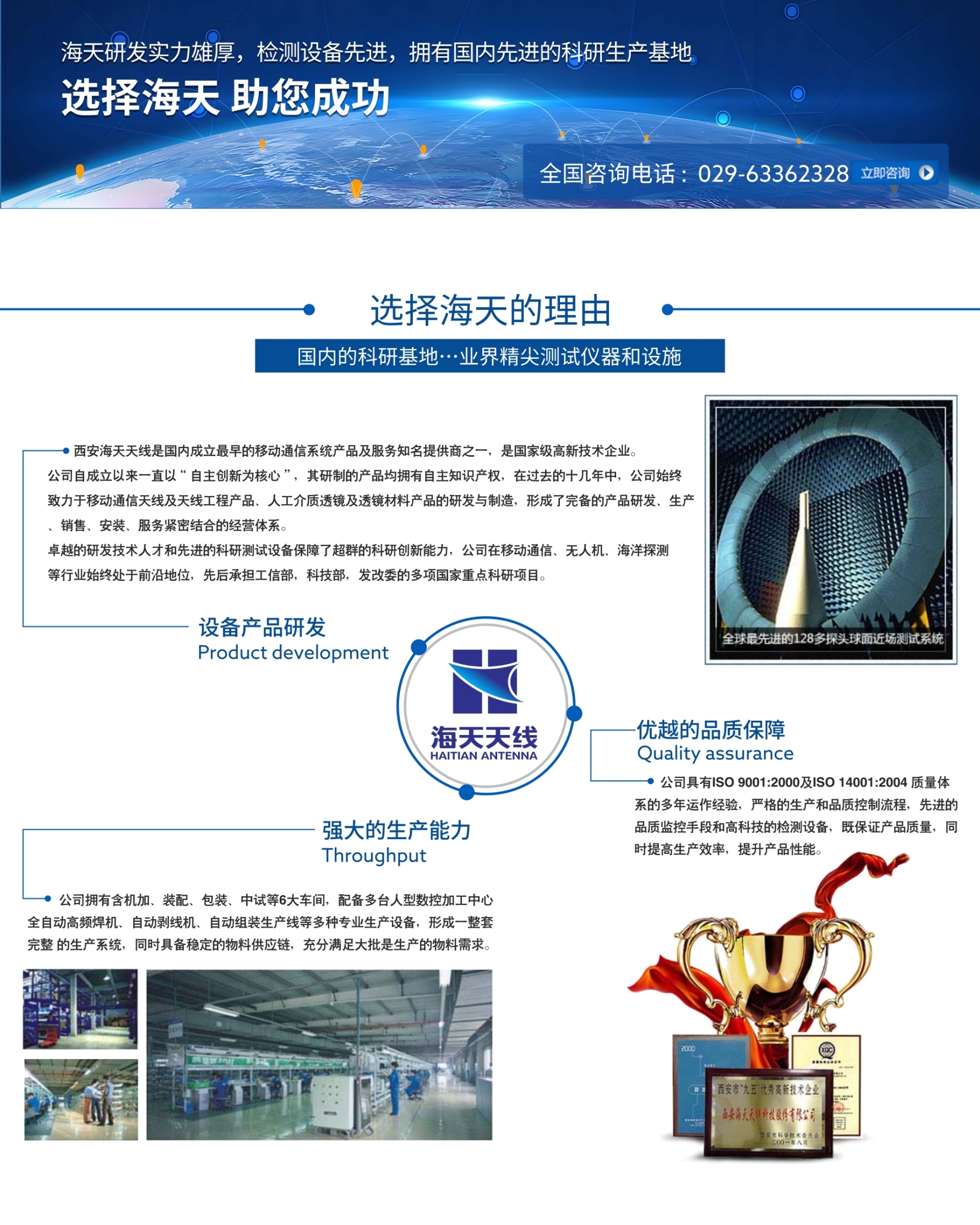 西安海天天線是國內(nèi)成立較早的移動通信系統(tǒng)產(chǎn)品及服務(wù)知名提供商之一,高新技術(shù)企業(yè)。公司自成立以來一直以“自主創(chuàng)新為核心”,其研制的產(chǎn)品均擁有自主知識產(chǎn)權(quán),在過去的十幾年中,公司始終致力于移動通信天線及天線工程產(chǎn)品、人工介質(zhì)透鏡天線的研發(fā)與制造,形成了完備的產(chǎn)品研發(fā)、生產(chǎn)、銷售、安裝、服務(wù)緊密結(jié)合的經(jīng)營體系。